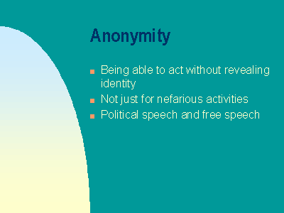 The idea of anonymity has gotten a bad name. People often feel that you only need to be anonymous when you have something to hide. But anonymity is actually the norm in many aspects of our lives. Every time to pay for something with cash, you are engaging in an anonymous transaction. You walk down the street, drive your car along roads, mail letters, all anonymously. We are beginning to experience a world in which fewer of our mundane, daily actions are anonymous. Yet the courts have affirmed that anonymous speech has a role in democracy in their ruling that supports anonymous political speech. |