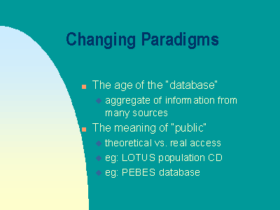 Computerized access to information requires us to re-think the meaning of "public" information. As part of our open, democratic society, we consider certain information to be public: voter registration, property ownership, marriage, divorce, birth and death records. There are also some records that are public although they might be embarassing, such as arrest records. In the pre-electronic world, to obtain these records you had to go down to the city or county hall of records in the relevant jurisdiction and look through paper or microfilmed documents. In the near future, much of this information will be available over computer networks and will be at the fingertips of many millions of people all over the globe. This easily available information will be used in ways that were never imagined. Does this change the meaning of the term "public information?"