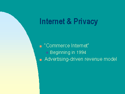 Privacy has been in the news quite a bit recently as more people have connected to the Internet and as the Internet has become a more commercial medium. Prior to 1994, no commercial use of the Internet was allowed because it received Federal funding. But that funding ended and the Internet become a private sector network. One of the difficulties faced by the private sector was that the Internet was not based on a commodity model and users were not accustomed to paying directly for access to information and services. In addition, the protocols or standards that underly the Internet do not provide for an easy method of payment.