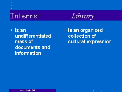There's also the question of quality vs. quantity. We know that the Internet has a certain amount of quantity, but there is no differentiation between materials of different qualities. A Nobel prize winning research paper can be retrieved alongside a personal home page with pictures of the author's cats. There are a lot of out-of-date materials on the Internet - Web pages that were created years ago and then abandoned. No one is weeding the Internet.