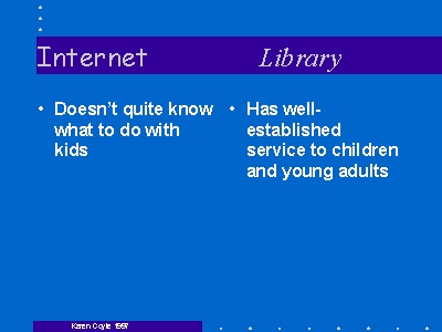 Many libraries are grappling with whether or not to use filtering programs to block Internet access to some kinds of materials. These filters only address one issue of appropriateness and they don't make the system "kid friendly." We still have no way to find science materials for 8th graders or 3rd grade readers. Service to children is not = keeping them away from pornography. It is much, much more. And the library does that "more" with its extensive services for children.